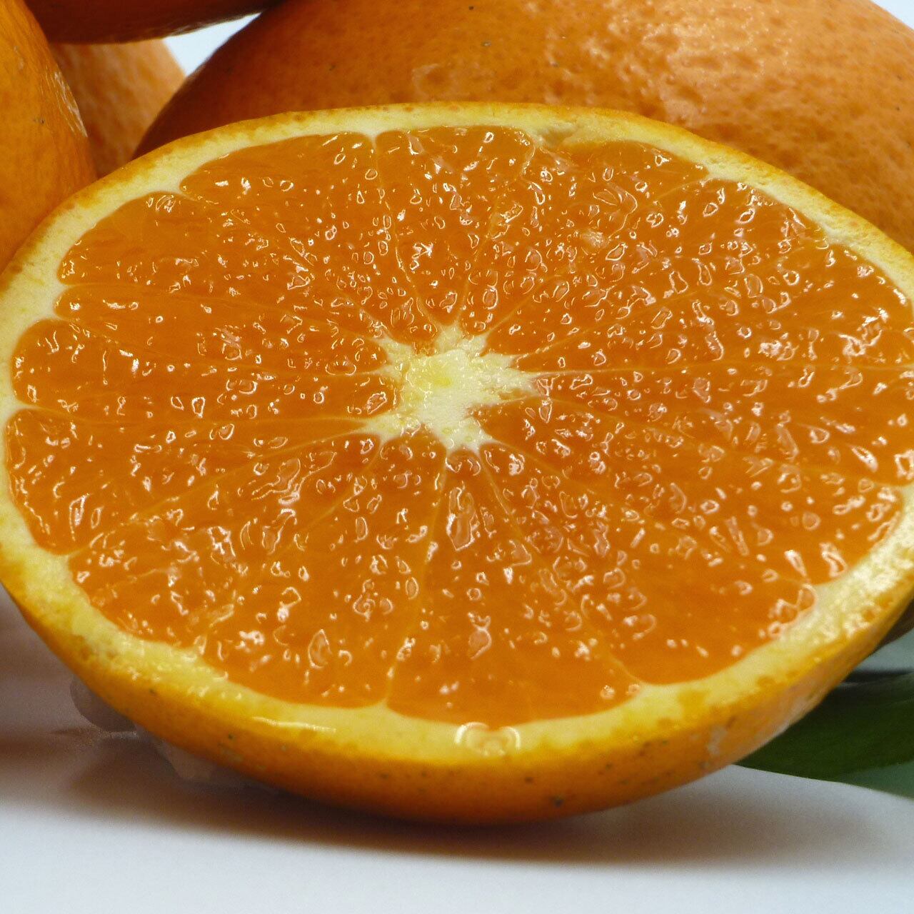 清見オレンジは、温州みかんとオレンジの交配によって誕生した柑橘で、温州みかんの甘みとオレンジの香りを受け継いだとても優秀な品種です。果肉は柔らかく、果汁は非常に多く、まるでゼリーを食べているかのような食感です。果肉が柔らかいので、ナイフでカットした方が食べやすいです。一般的には200∼250g位の大きさなのですが、当農園の清見オレンジは大きいものでは500g(あまなつ位)のサイズがあり、見た目にも存在感があります。毎年ご購入される方が多い人気品種です。